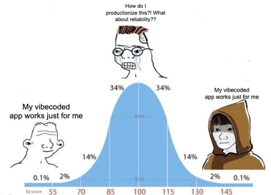 Seeing all the hot takes (including my own), we know that it takes a village to go from vibecoded prototype → production software (reliability, evals, safety, etc), but there’s a lot of value in simply vibecoding a whole village of prototypes just for oneself. The next time you find yourself shouting at a screen because an app is too slow, too expensive, or too full of ads, don’t look for a better product. Just build a worse one. Build it poorly, build it fast, and build it for an audience of exactly one.